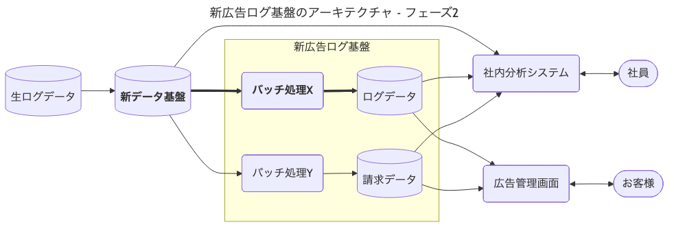 ここでいう全体最適とは、広告ログ基盤リアーキテクチャのスコープを超えた全社としての優先度の話です。 広告ログ基盤リアーキテクチャを進める傍ら、別のプロジェクト「データ基盤リアーキテクチャ」が進行していました。 データ基盤リアーキテクチャとは、アーキテクチャの図に記載している「データ基盤」を「新データ基盤」に移行するプロジェクトです。