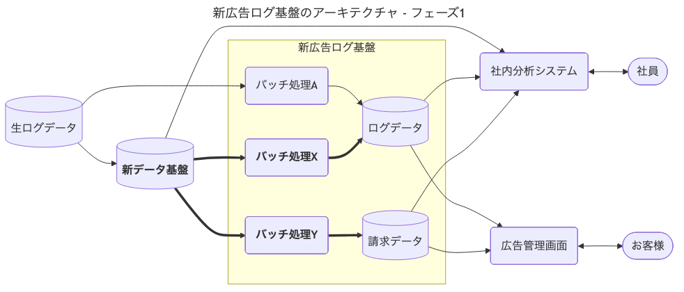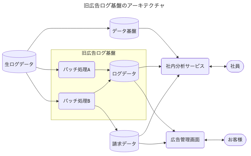 - 広告ログを集計する経路が3つ存在する(データ基盤、バッチ処理A、バッチ処理B)。