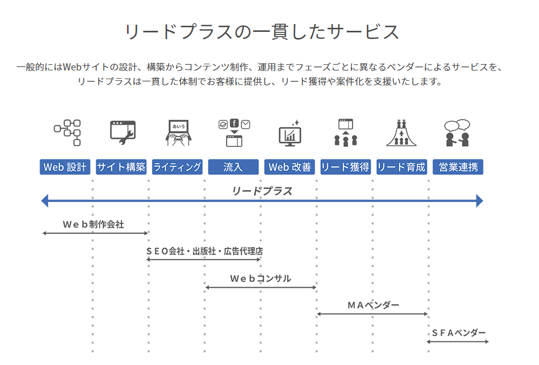 リードプラスでは、構築・運用、Webサイト制作、コンテンツ制作、組織作りに至るまで、