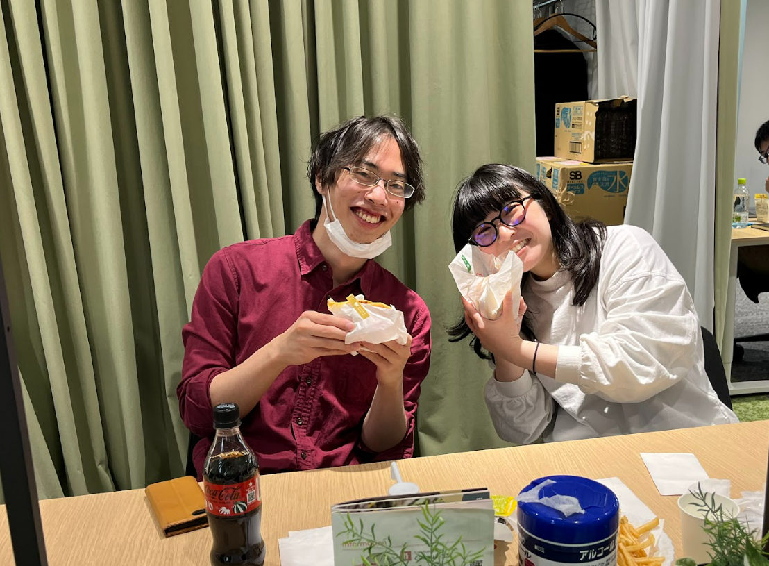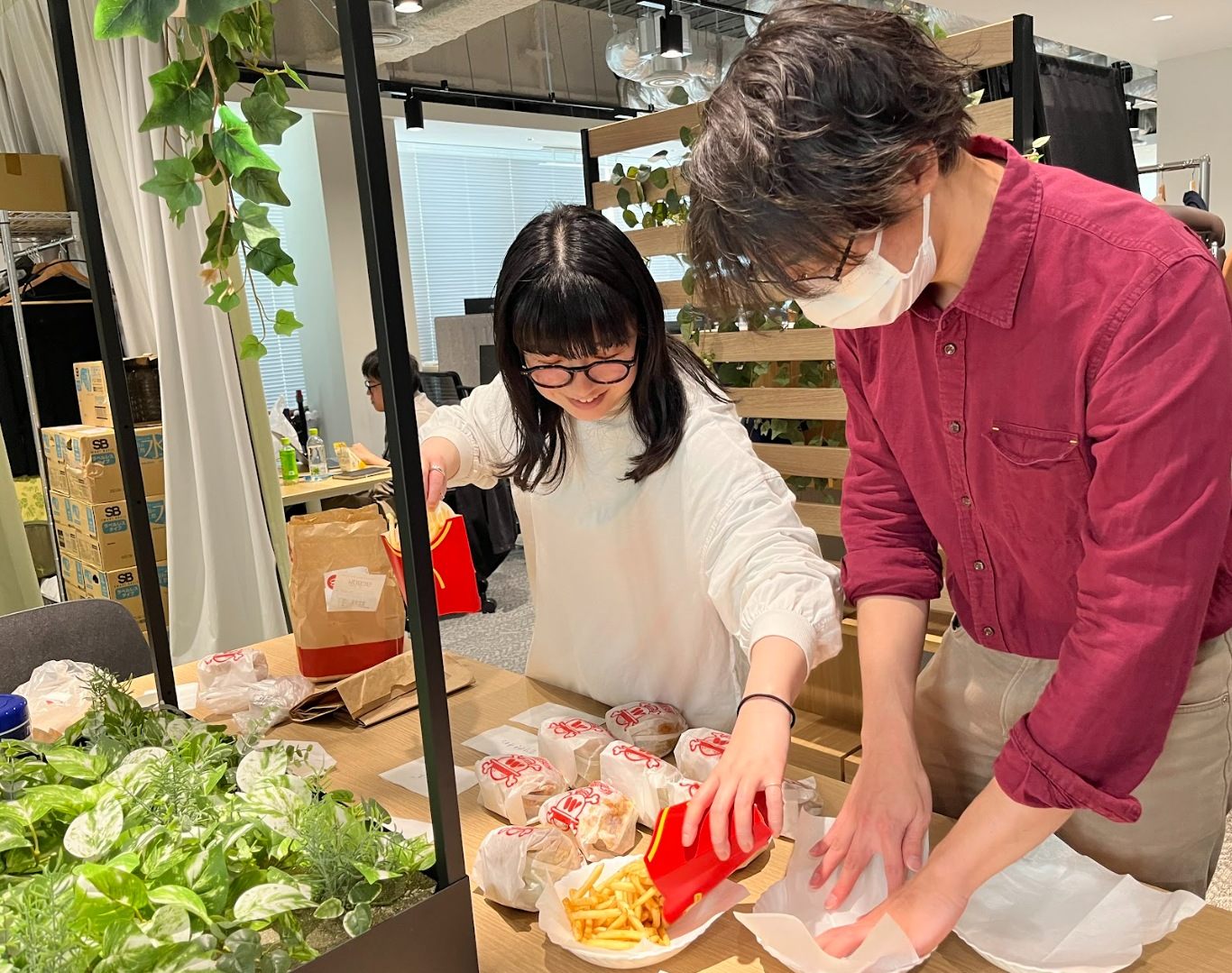 ▼「箱に入ったままだとシェアしずらいよね」と、お皿を出してポテトを分けてくれたメンバー。