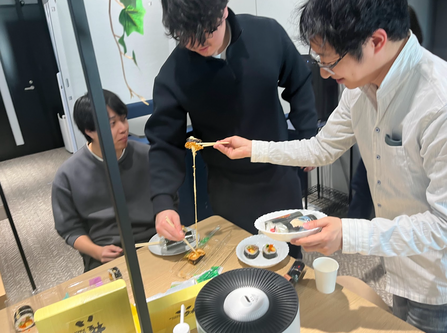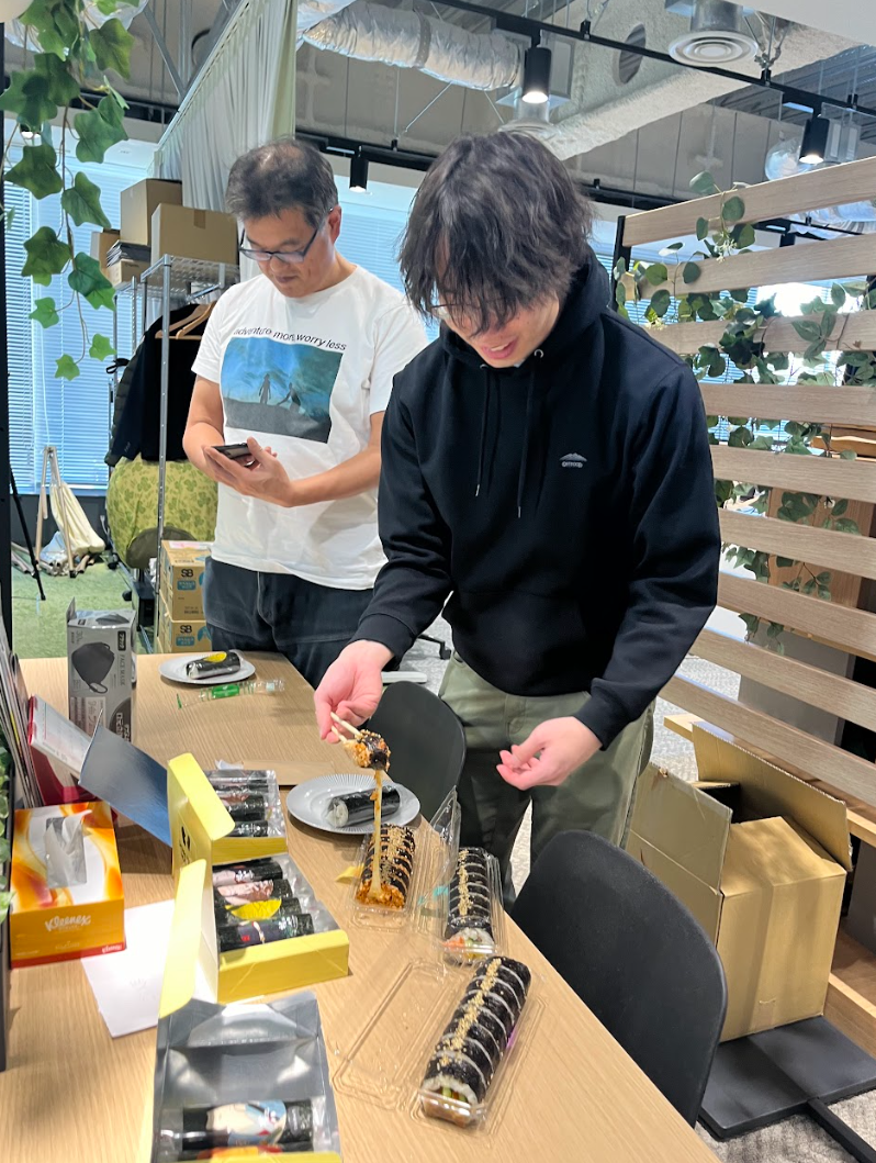 「長いも明太」「鰻きゅうり」「サーモンいくら」「エビアボカド」「とろたく」など、選ぶのが楽しいラインナップだったからか、トレーディングチーム宮本氏は悩みに悩んでいました。笑