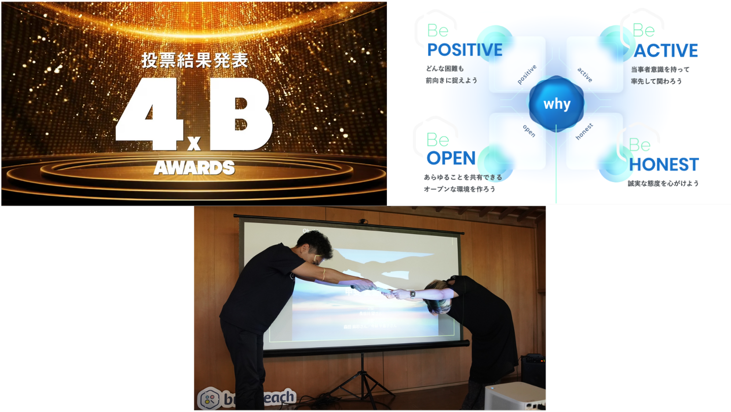 後半の部署発表が終わったあとは、Buzzreachのバリューをもっとも体現している人たちを表彰する「4xB AWARD」を実施。Be POSITIVE、Be ACTIVE、Be OPEN、Be HONESTの4つのバリューをもっとも体現していると思う人に社内で投票しました。