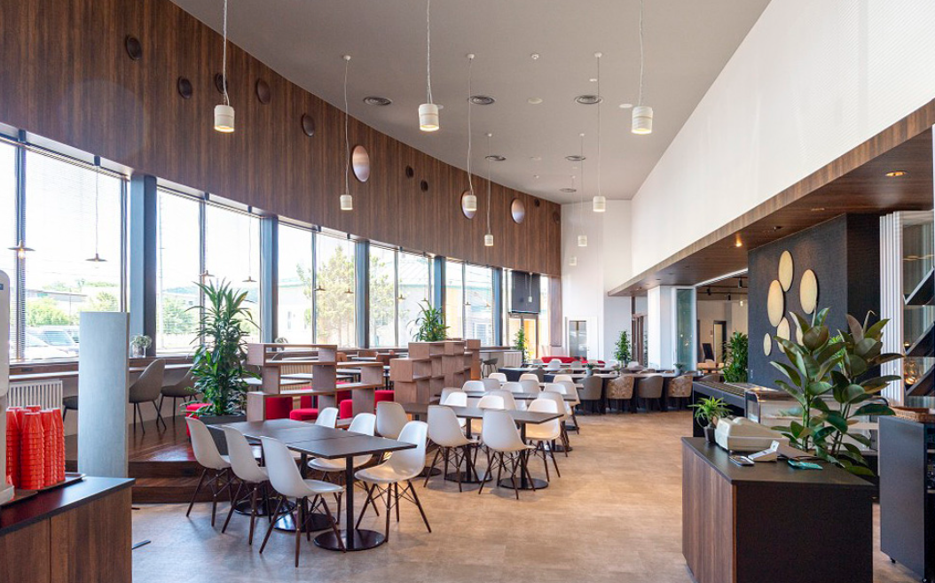 オフィス環境:新しく綺麗で、整備の行き届いた環境です。社内カフェテリア、企業内保育園「オランジェリー」など、社内設備が充実しています。