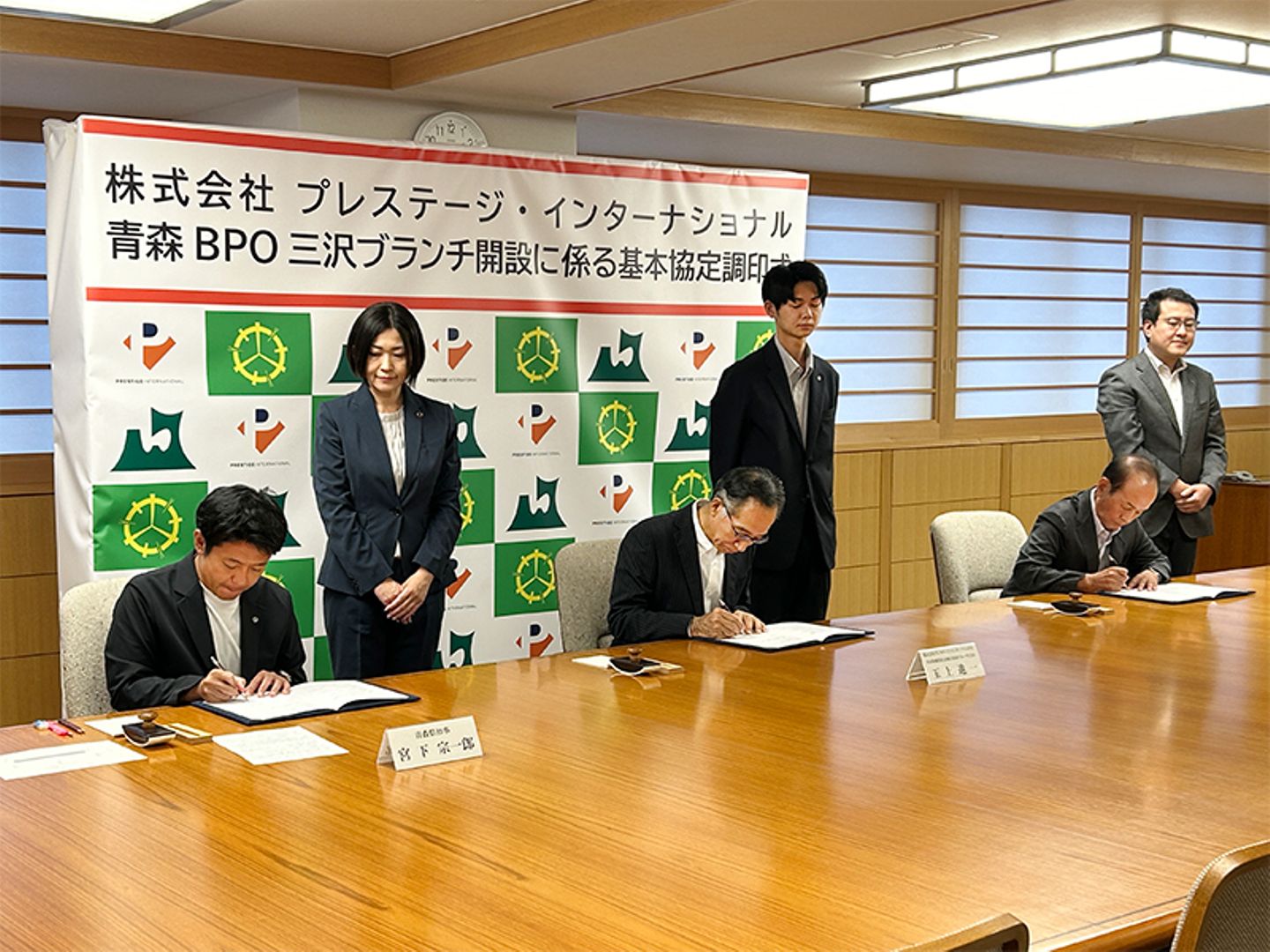 株式会社プレステージ・インターナショナルは、青森県三沢市への進出を決定し、三沢ブランチ(仮称)開設にあたり9月12日に青森県庁において青森県および三沢市と基本協定締結式を実施しましたことを
