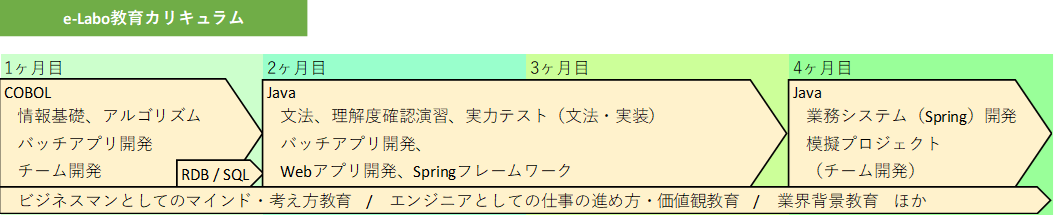 - 模擬プロジェクト体験:概要設計、プログラミング設計、実装、単体テスト、結合テスト。見積や各種管理(進捗、QA、品質ほか)