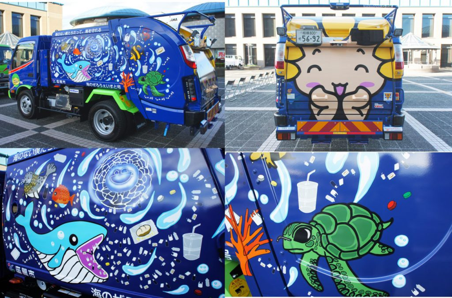 1台は、座間市クリーンセンターの職員の方々が考案し描いた、街や河川を通じて海に流出してしまう海洋プラスチック問題を伝える「海のぜろうぇいすと号」。一見、キラキラした海をかわいいクジラやアザラシ、カメが泳いでいるようにみえます。ただ、よく見るとキラキラの正体はプラスチックごみ。動物たちも、その被害を受けている様子が描かれています。