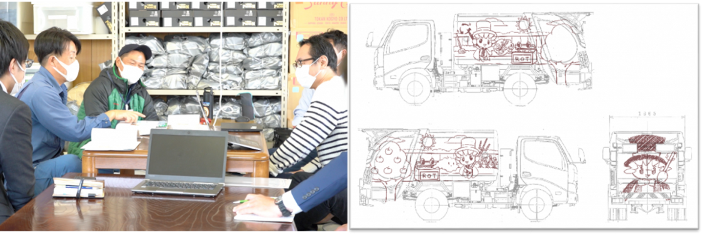 今回、新たに加わったのは2台のごみ収集車。この2台は、座間市クリーンセンター職員の方々とWOOMSチームのメンバーとが、ごみ収集車を市民啓発に活用できないかということから、お互いにアイデアを出し合い、ディスカッションを重ね、デザインしたものになります。
