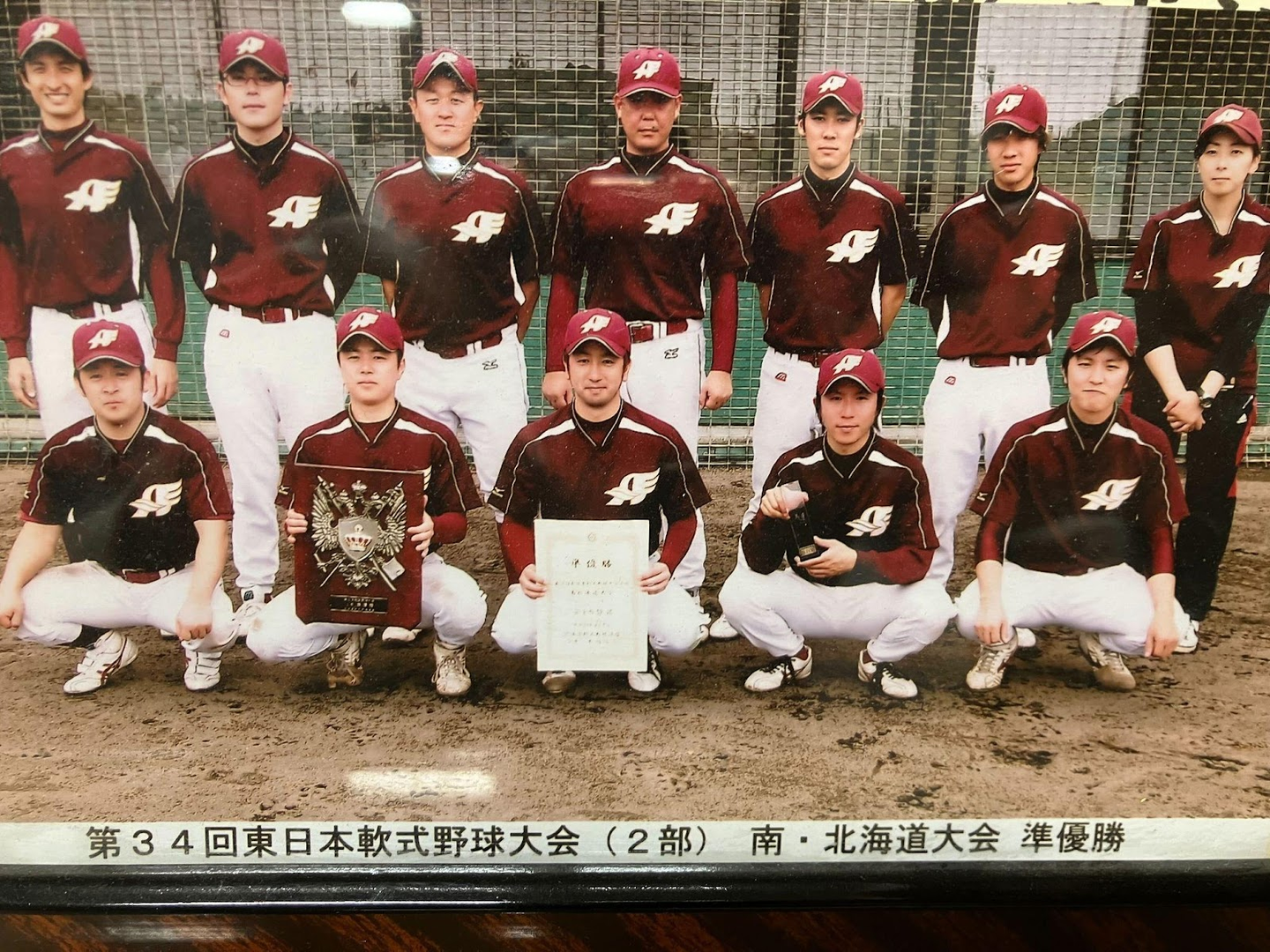 ▲平成23年、安平町役場で東日本軟式野球大会2部南北海道大会へ出場し、準優勝した時の集合写真(前列右)