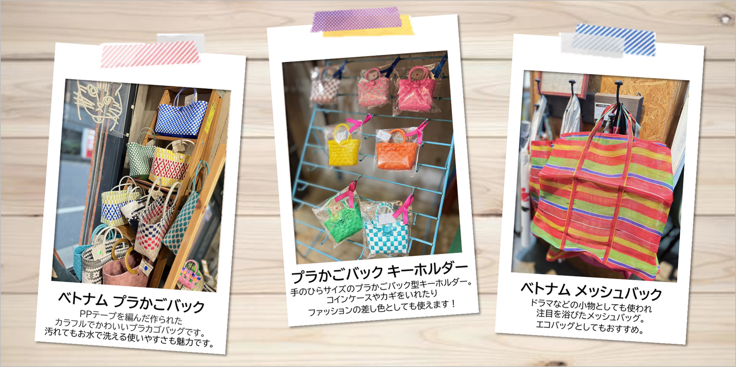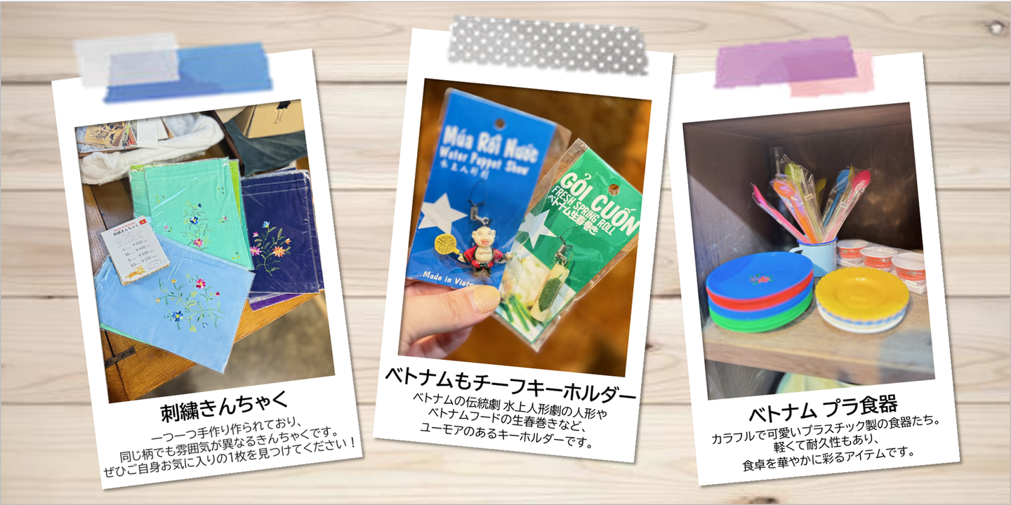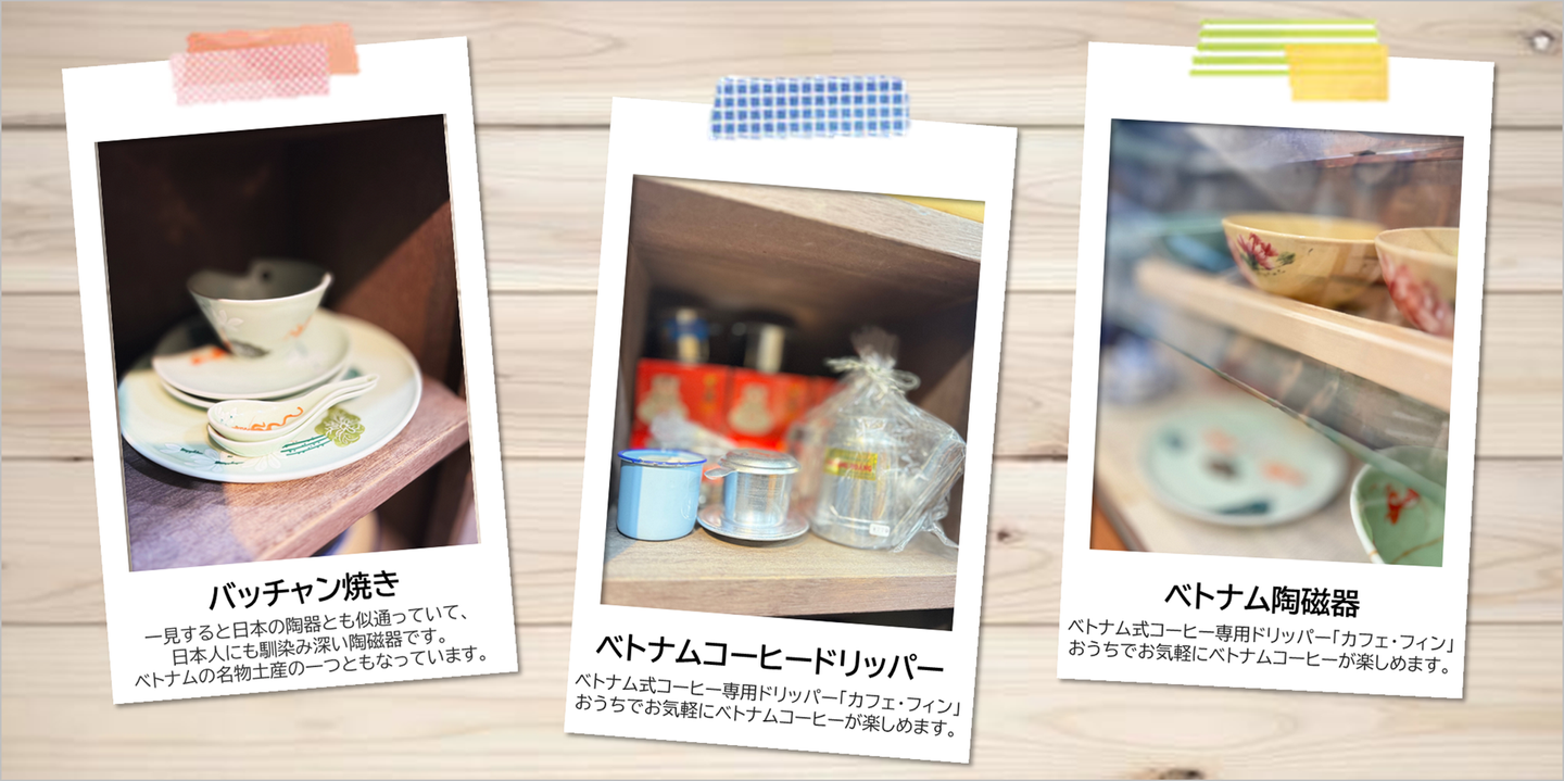 店内には、スタッフが海外現場に行った際などに買い付けてきた、ベトナムや東南アジアの雑貨が所狭しとたくさん並んでいます。
