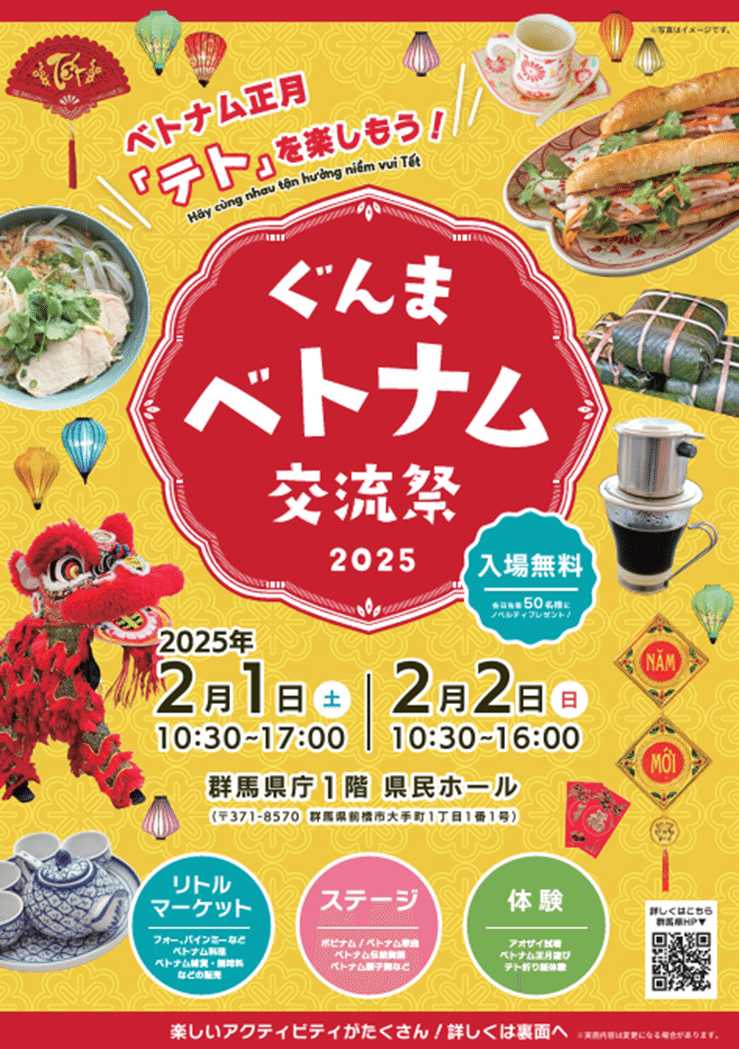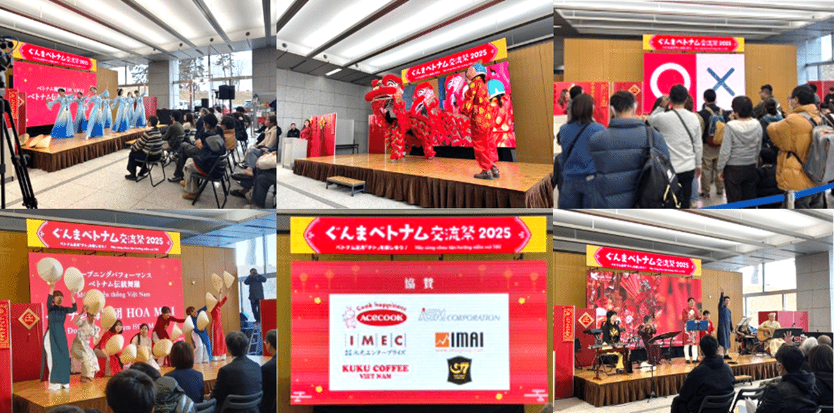 2025年2月に、ベトナムのお正月「テト」を祝うイベントとして、群馬県庁にて「ぐんまベトナム交流祭」が開催されました。このイベントは、群馬県民の皆さんにベトナムを身近に感じてもらうとともに、県内に多く暮らすベトナム人に故郷の雰囲気を味わっていただくために開催しているものです。