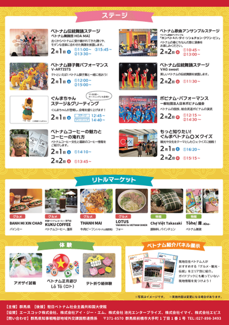 ステージでは、新年を祝う獅子舞や、ベトナム舞踊、ベトナム楽器を編成したバンド演奏などのベトナムらしい華やかなパフォーマンスや、楽しみながらベトナム文化と群馬県のことを知っていただけるお客様参加型の〇×クイズステージ、ベトナムコーヒーの淹れ方のレクチャーステージなど、様々なコンテンツが会場を盛り上げました。