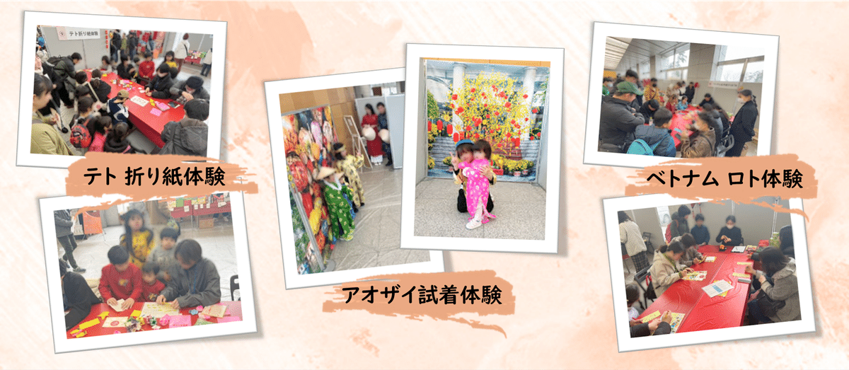 文化体験コーナーでは、ベトナムの伝統衣装「アオザイ」を試着し、写真撮影できるコーナーや、ビンゴに似た正月遊び「ロト」、テトに関するモチーフを折る折り紙体験などのコーナーを展開。