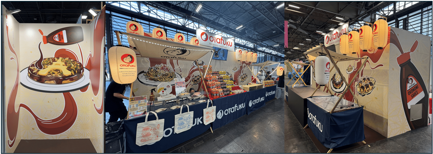 デザイン面では、和の要素を基調にしつつ、ロゴや粉モンのイラストを目立たせ、会場内でもしっかりと存在感を放てる構成に。来場者の目に留まり、世界観を感じてもらえるブースづくりを目指しました。