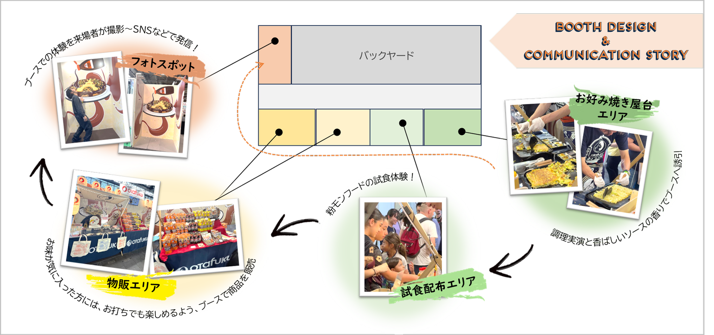 来場者へのコミュニケーションストーリーとしては、試食→販売という流れでotafukuブースを来場者の方に体験していただきたいというクライアントの要望があったので、