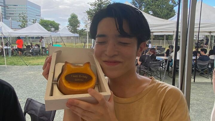 サウナ大好き、フルーツが得意ではない田村さんにサウナチケットとチーズケーキをプレゼントし、みんなでお祝いしました!