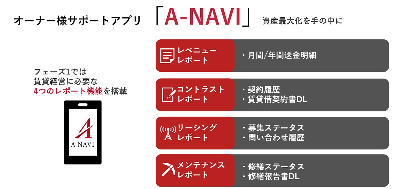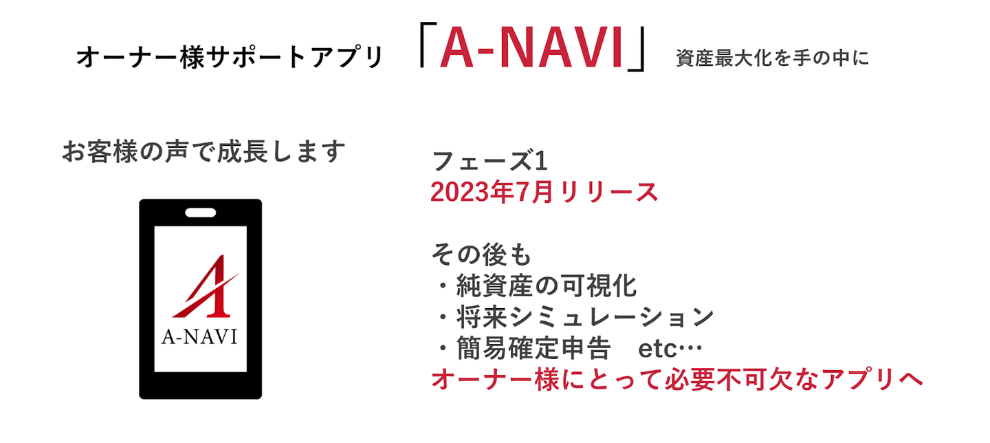 賃貸管理の中で、今年7月オーナー様 サポートアプリ 「A-NAVI」がリリースされました。内容は下記の通りです。