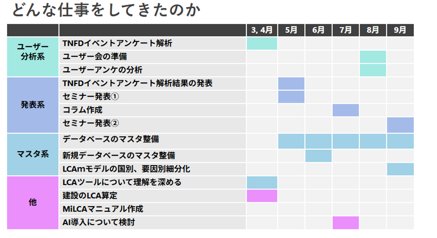 ユーザー分析系では、ユーザーニーズをアンケートから分析する仕事をメインで行いました。発表する機会にも幸運なことに恵まれ、各種セミナーでの発表や、コラムの執筆公開を行いました。本インターンシップでのメインの仕事はマスタ整備でした。マスタというのは、製品や部品、材料などに関する基礎データのことを指し、LCA(ライフサイクルアセスメント)を正確に行うための土台となる情報です。具体的には、各製品がどのような材料で構成されているか、どの工程でどれだけの資源やエネルギーが使われているかといったデータを整理・登録し、正しい分析ができる状態に整える作業です。それら以外にも、LCA算定業務やマニュアル作成業務、そしてAIの社内導入への検討も参加しました。