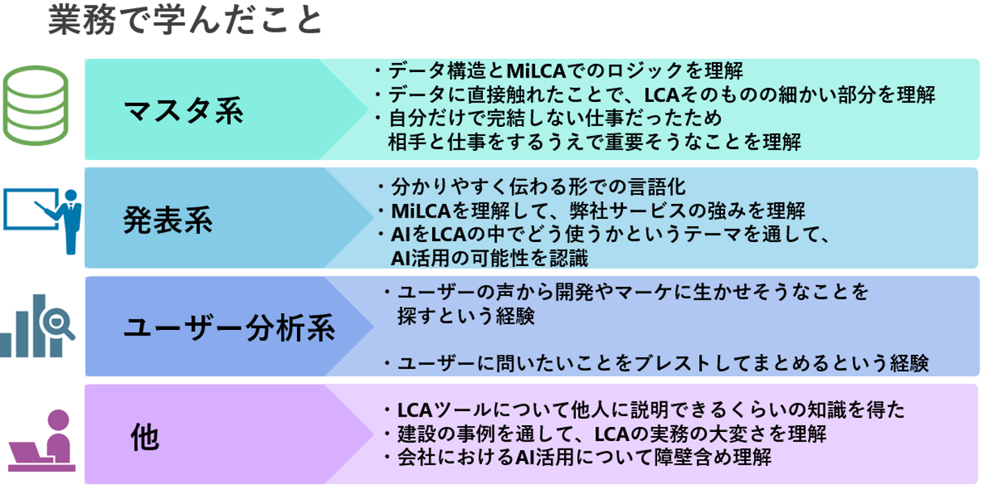 次に 発表系の業務 では、内容を分かりやすく伝えるための言語化スキルを養いました。MiLCAの理解を通じて自社サービスの強みを再認識するとともに、AIをLCAの中でどのように活用できるかを考えることで、AI活用の可能性について新たな視点を得ました。