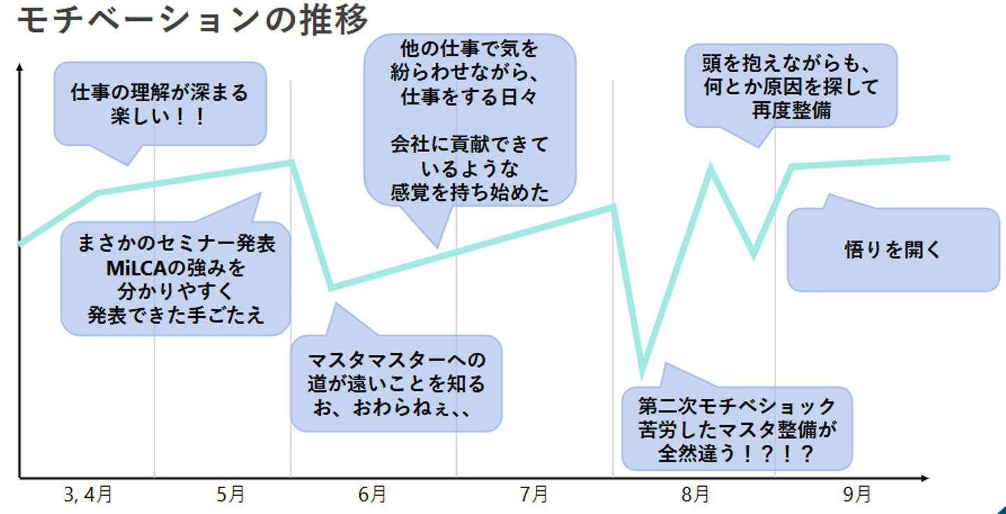 5月末からは大きな業務である環境負荷原単位データベース更新に伴うマスタ整備に着手しました。しかし、その複雑な構造や更新作業の繊細さ、関係者が多いがゆえに思うように進まない点など、数々の壁に直面しました。「マスタマスターへの道は遠い」と感じるほど苦戦し、モチベーションも大きく下がってしまいました(第一次モチベショック)。