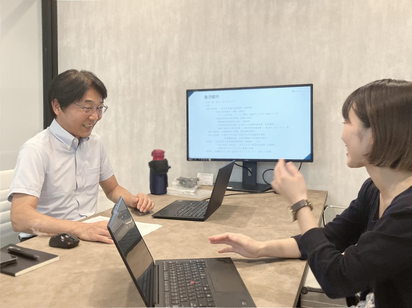 胡:私が退職した後、「昔ここにいたんだよ。すごいでしょ。」と自慢できるような会社になってほしい。企業の成長ももちろんですが、世の中に「LCA」をどんどん広めていってほしいですね。「LCAの社会実装を通じた持続可能な社会への移行」がLECのミッションでもあります。 今後はさらに「攻めのLCA」で幅を広げていきたいです。