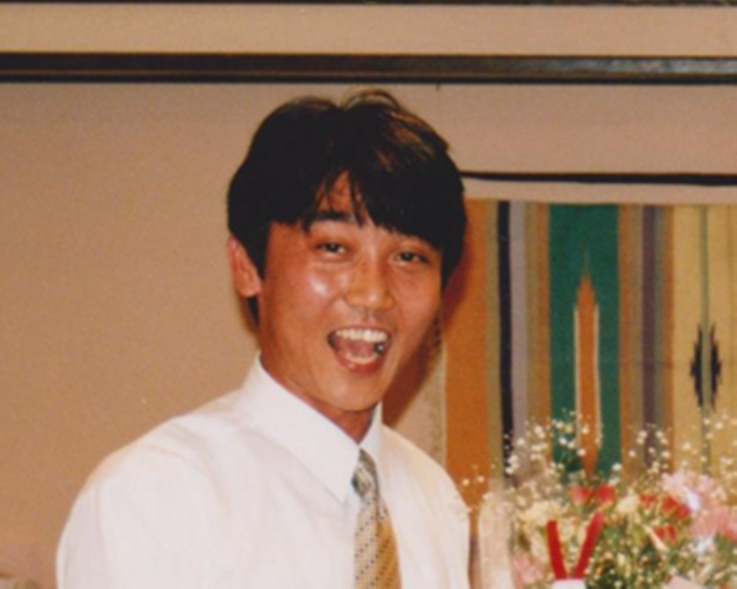上記写真:花束をもらっているのではなく、渡しているだけなのにとてもうれしそうな胡さん(30年前)
