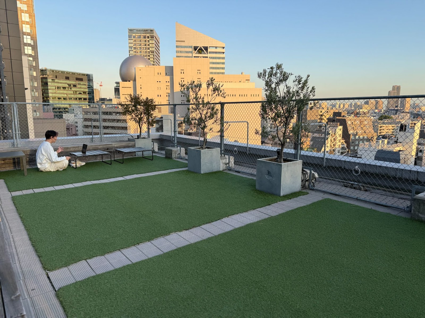 都会のオアシスのような屋上の芝生エリア。天気の良い日は、屋外で休憩やミーティングができますよ◎