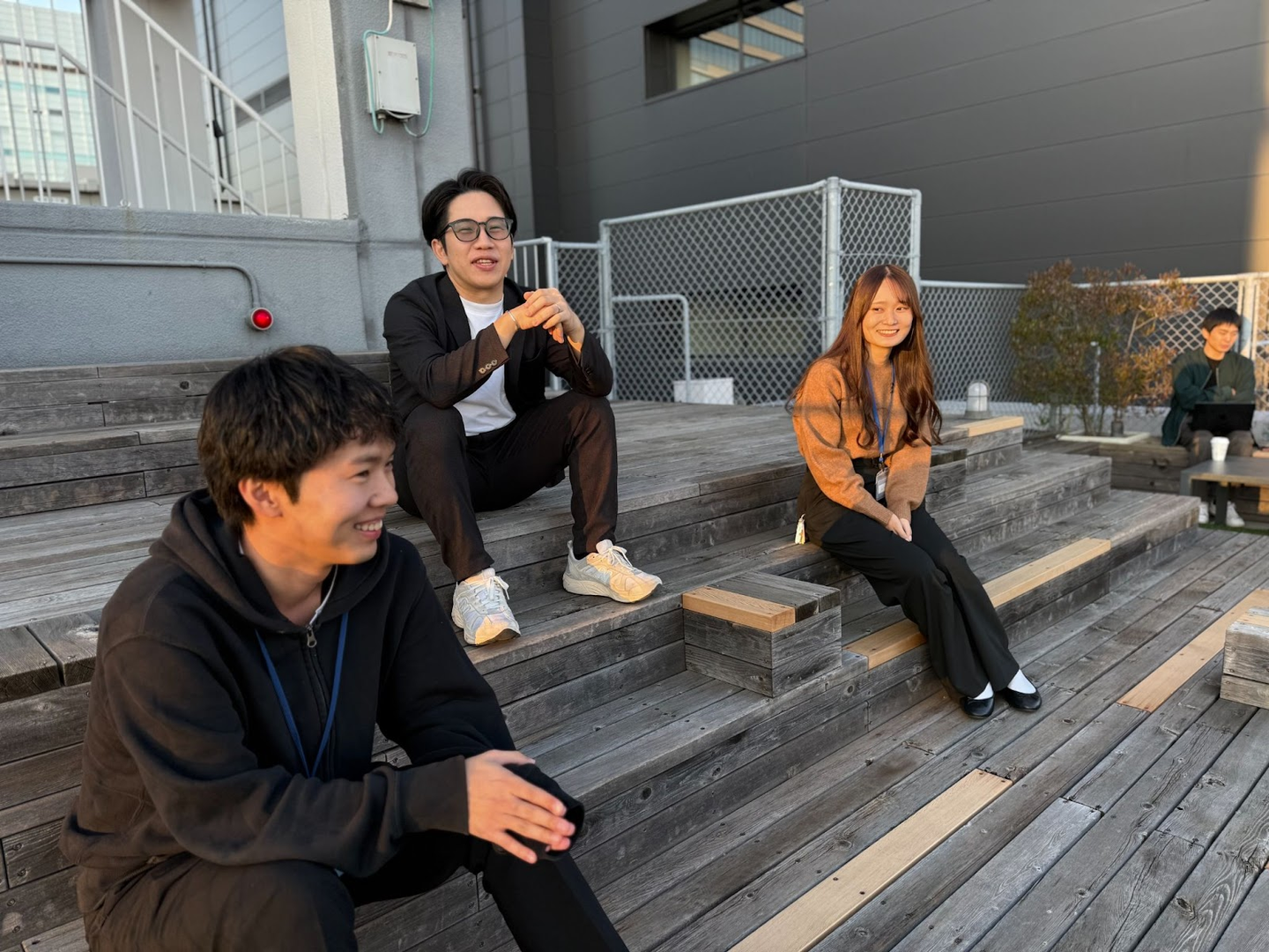 屋上のウッドデッキエリア。ちょっとひと息つきたいときはここがおすすめ。雑談もはかどります。