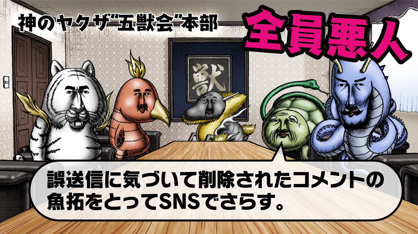 任侠道を極め、神となった獣たち、五獣。彼らの集まりである五獣会、そこの幹部定例会が開かれていた。そんな彼らには近年、目の上のたん瘤となっている「もののけ組」という存在がいた。彼らは定例会のついでに、対応策について話し始める。会議の中で、彼らが妖怪と間違われているという情報も出てきて......。果たして彼らは、自身が 妖怪に間違われるというこの不可解な現象を科学的に解明しようと話し出す。