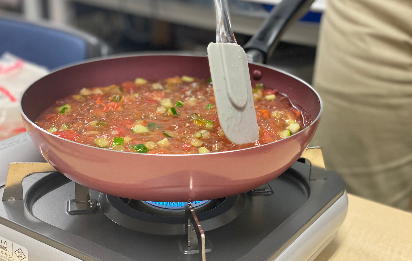 再度、具が均等になるようにかき混ぜます。ちょっとお疲れ気味?意外と力仕事なのです。