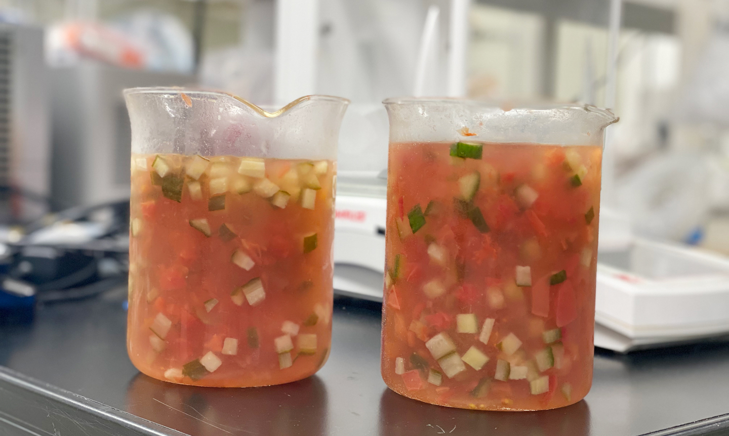 1,000mlビーカー2つに、大量のピクルス食材とスペースソルト、調味料を入れて、ゼリーピクルスを作ります。
