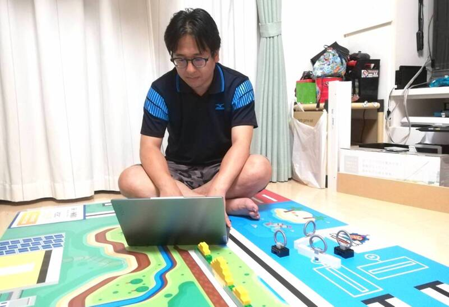 ▲家にロボコンのコースを置いて検証作業などを行っている