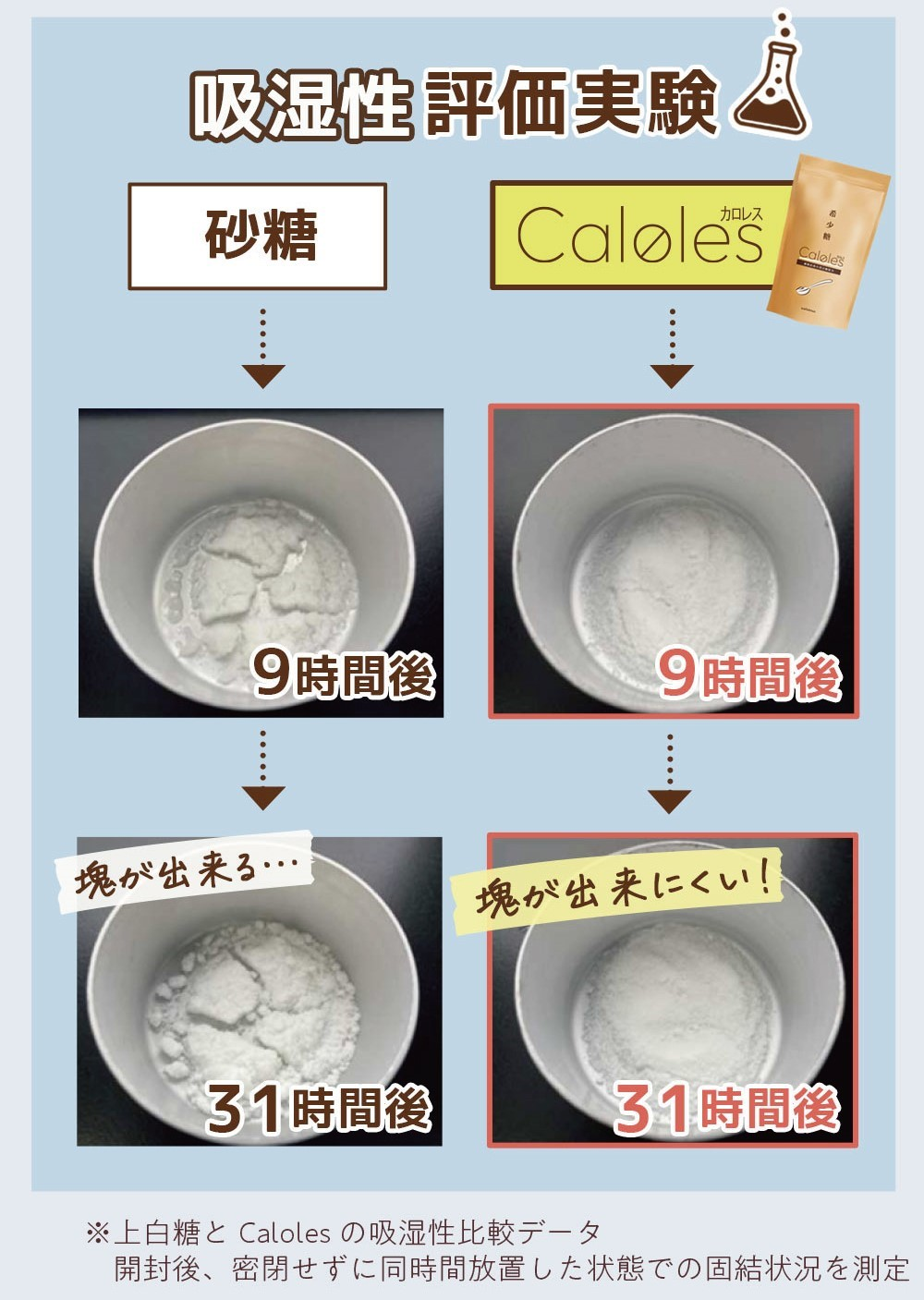 ※上白糖とCalolesの吸湿性比較データ。開封後、密閉せずに同時間放置した状態での固結状態を測定