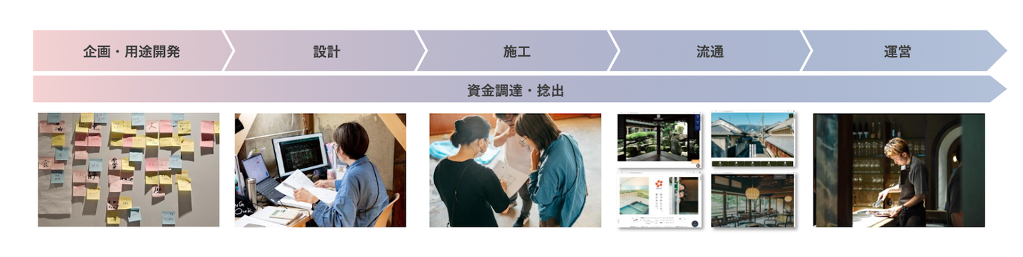 私たちが行っていることはただの建物再生ではありません。 設計、資金調達、運営に至るまで。 すべてのプロセスを一貫して担うことで、地域に根ざした新たな経済循環を生み出してきました。地域企業や金融機関と一体となって、持続可能な観光地域経営を具現化してきました。