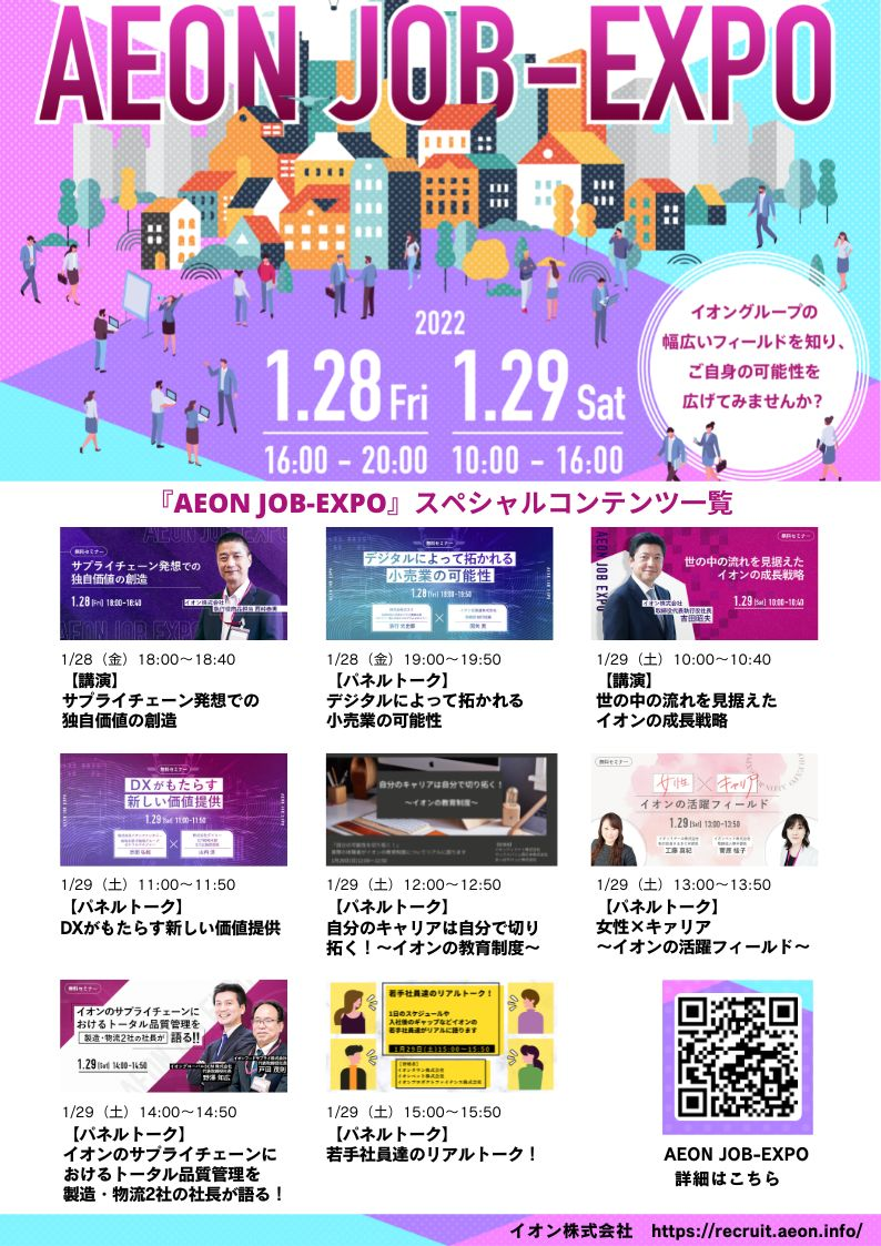 イオン株式会社Followhttps://recruit.aeon.info千葉県FollowHomeAbout usMembersStoriesJob postings イオングループジョブイベント “AEON JOB-EXPO” 開催決定! Yamasaki Yoshimi 人材育成部 on 2022-01-21 グループ会社27社が集結!新卒・中途合同イベント!特徴1:イベントを通して、たくさんの企業と出会える!特徴2:社長講演や各分野の専門家や若手社員によるパネルトークなど魅力が満載!特徴3:採用担当と直接話して、気になることを気軽にご質問いただけます◆イベント詳細はこちら◆イベントお申し込みはこちら◆スペシャルコンテンツ視聴のみご希望の場合はPeatixよりお申込みをお願いいたします。※イベント参加の方はすべてのコンテンツがご視聴いただけます※イベント参加費:無料※イベント申込み:1月27日(金)までお気軽にご参加ください! イオン株式会社's job postings イオングループジョブイベント “AEON JOB-EXPO” 開催決定! Yamasaki Yoshimi イオン株式会社 / 人材育成部 中途 新卒 イベント セミナー イオン 1 Likes Share 1 Likes