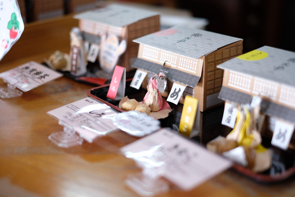 看板商品の「飴ん子」は、一般的な硬い飴とは異なり、噛むと優しく砕ける食感です。お店をモチーフにした可愛らしい箱に入っており、お土産にぴったりですね。飴ん子にも種類があり、プレーンのしろ、きなこ、加賀棒茶、期間限定のいちご味などを楽しむことができます。