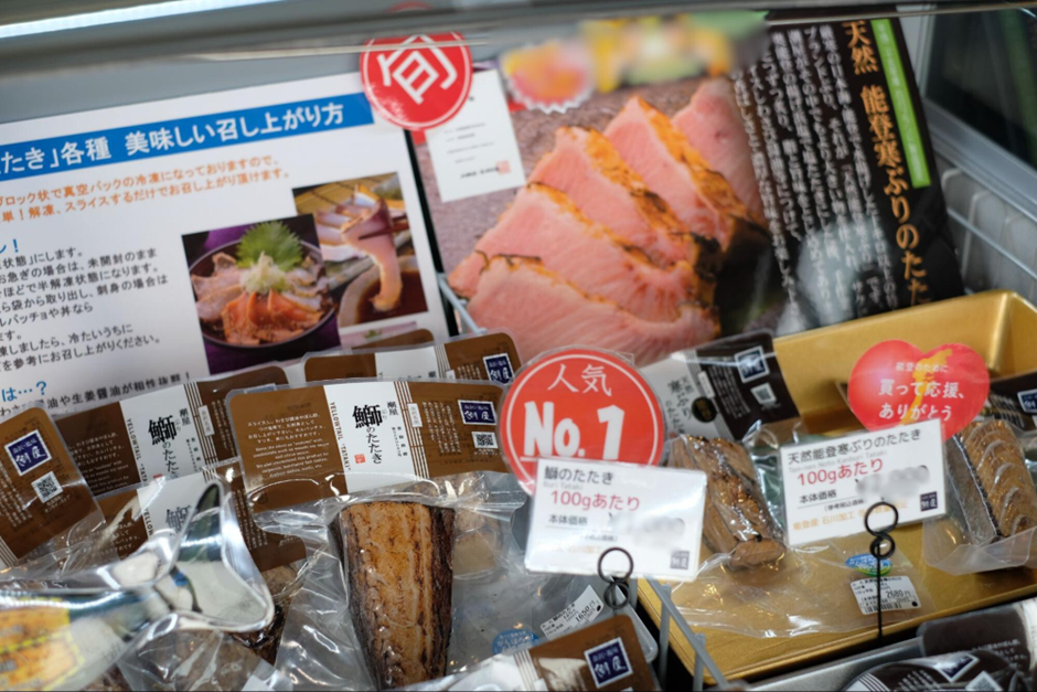 看板商品の鰤のたたきは「鰤の美味しさを全国に伝えたい」という想いから、急速冷凍技術と冷凍後の劣化を防ぐために炙って水分を飛ばすなど、試行錯誤を重ねて冷凍保存を実現されているそうです。天然の能登寒ぶりがとても美味しそうでした!