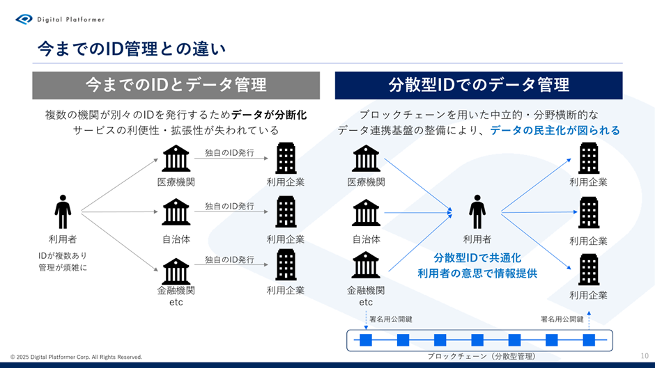 澤田: そうなんです。だからこそ、『今の仕組みのままでは、何かあった時が心配だ…』『自分の大切な情報は、やっぱり自分でしっかり管理したい』という課題意識やニーズが高まってきました。つまり、これまでの便利なID管理の良さは活かしつつ、その課題点を克服しようとするのがDID/VCです。