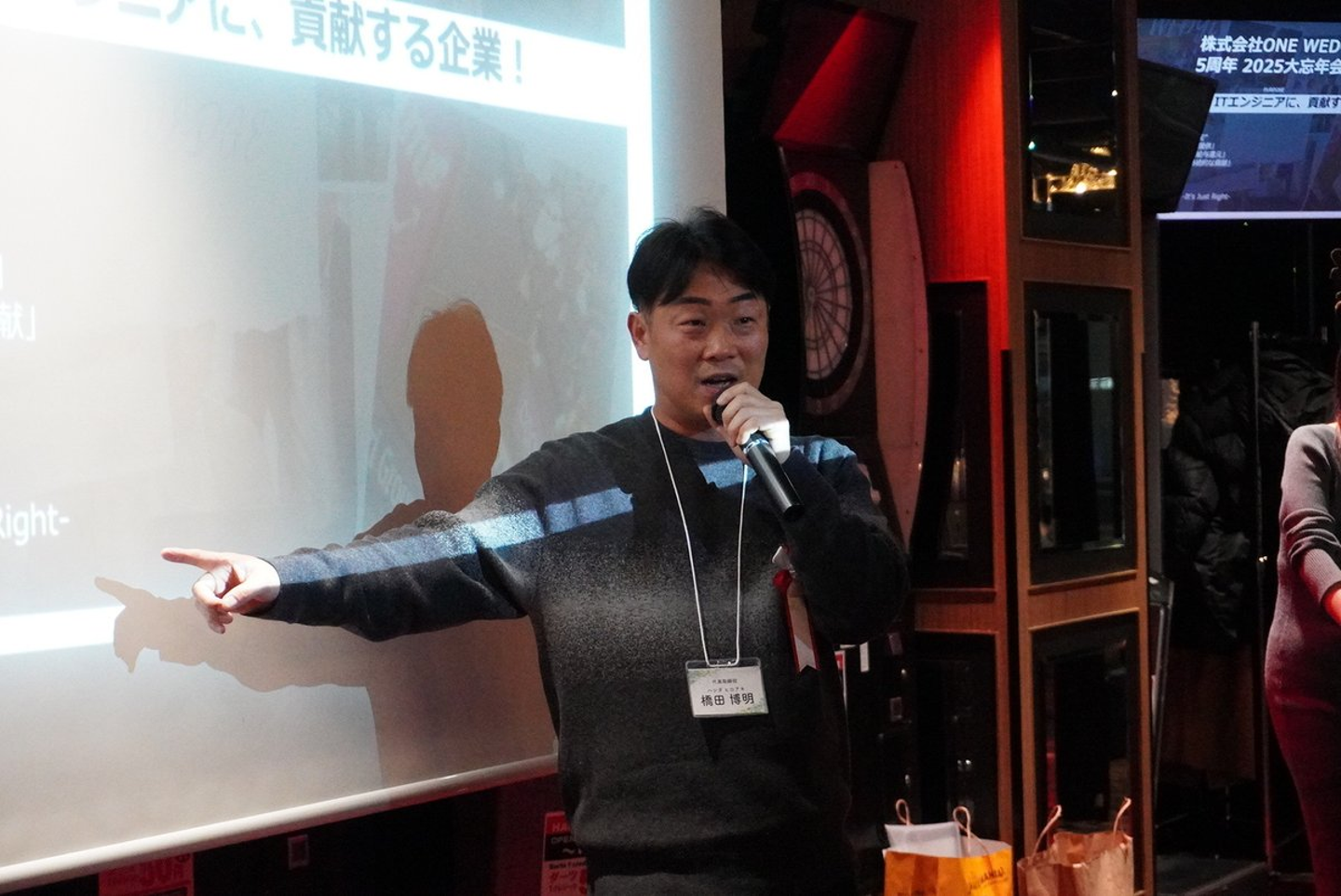 代表からの挨拶では、改めて創業当時からこれまでの歩みや売上についての振り返りがありました。そして話の終盤には、ONE WEDGEの社員も思わずざわつく(!?)驚きの重大発表も…!💥