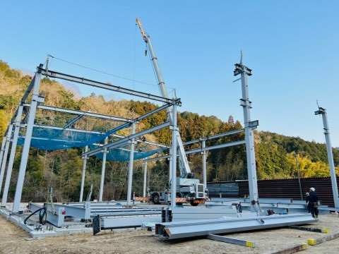 晴天にも恵まれ新工場建方1日目がスタートしました。