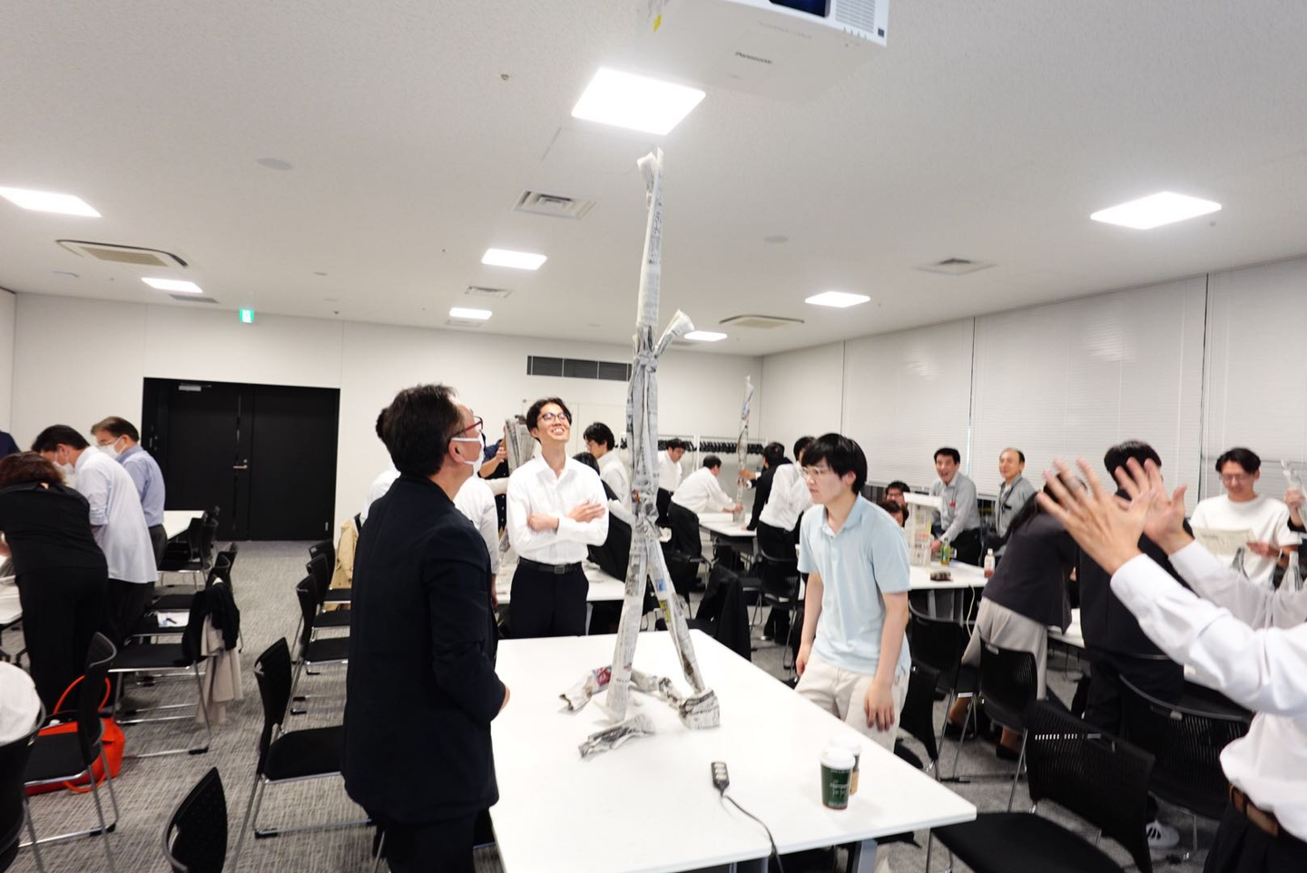 今回一番高くタワーを建てられたチーム。なんと2m超え。写真右の谷口CTOの手が何とも言えない臨場感。