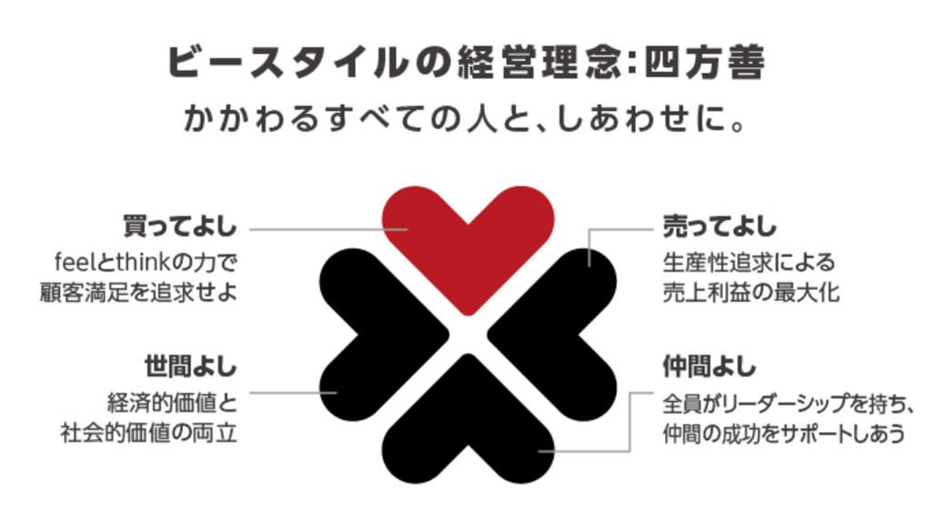 ビースタイルグループは「四方善~かかわるすべての人と、しあわせに~」を経営理念としており、ロゴマークでも「三方善」に「仲間よし」を加えた「四方善」を表しています。