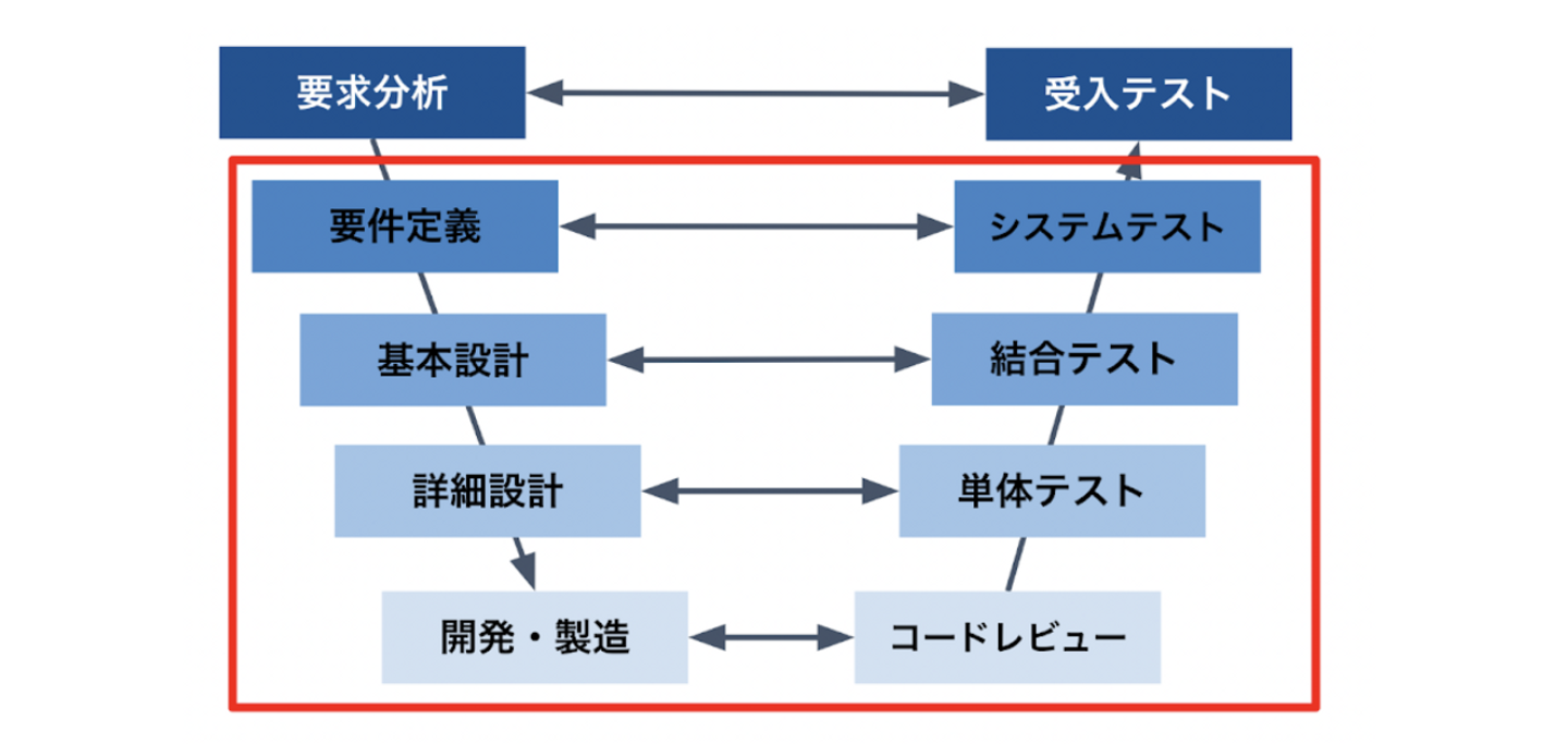 今回のプログラムで網羅しているのは、ソフトウェアの開発プロジェクトにおける、開発からリリースまでの一連の流れを表したいわゆる「V字モデル」の赤枠の部分です。