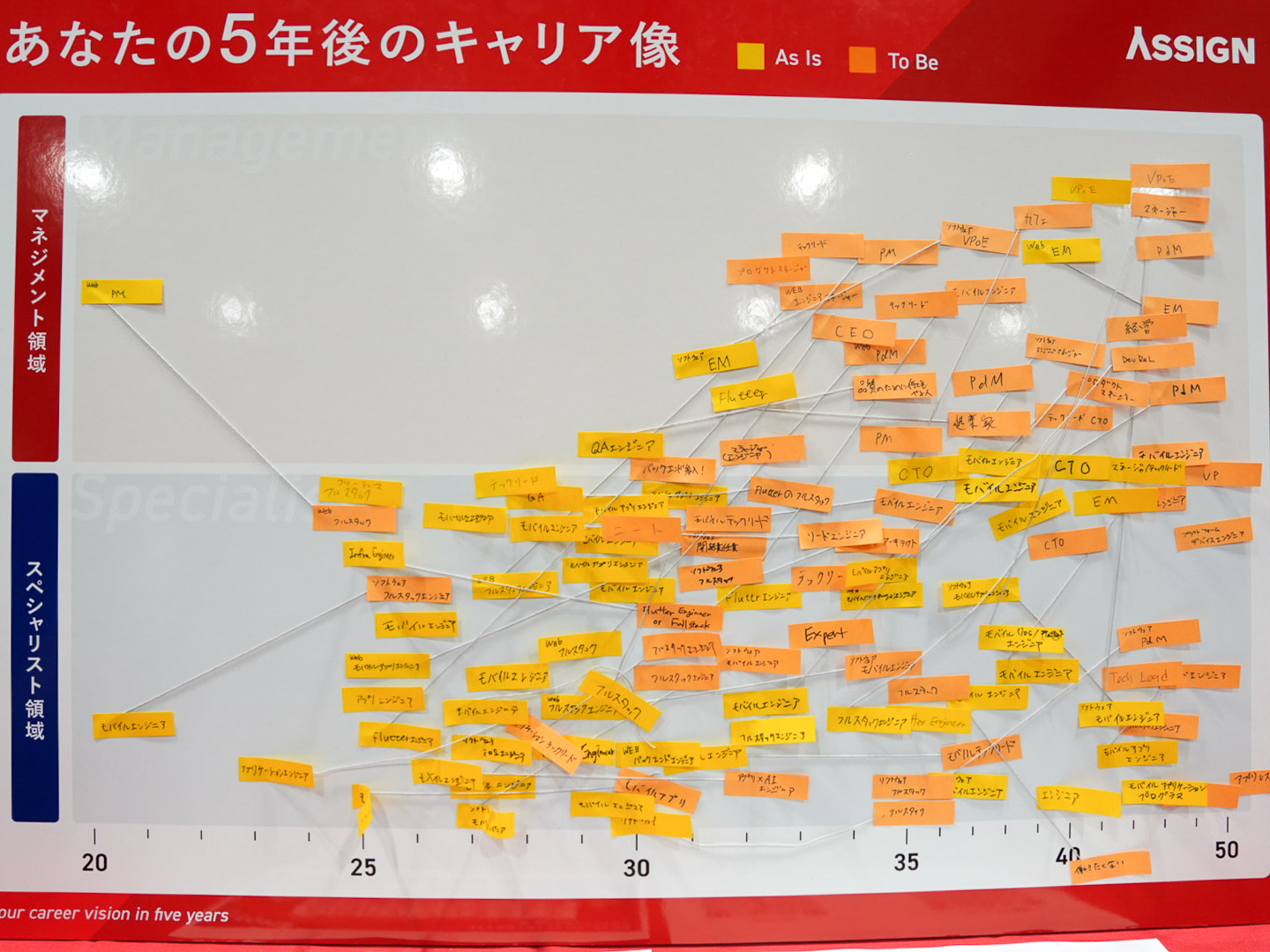 参加者の方との交流のため、「あなたの5年後のキャリア像」を伺うボードを設置しました。黄色の付箋が現在の業界や職種を表し、オレンジ色の付箋で5年後のキャリア像を書いていただきました。それぞれの付箋を紐でつなぐことで視覚的にキャリアの遷移を表しています。