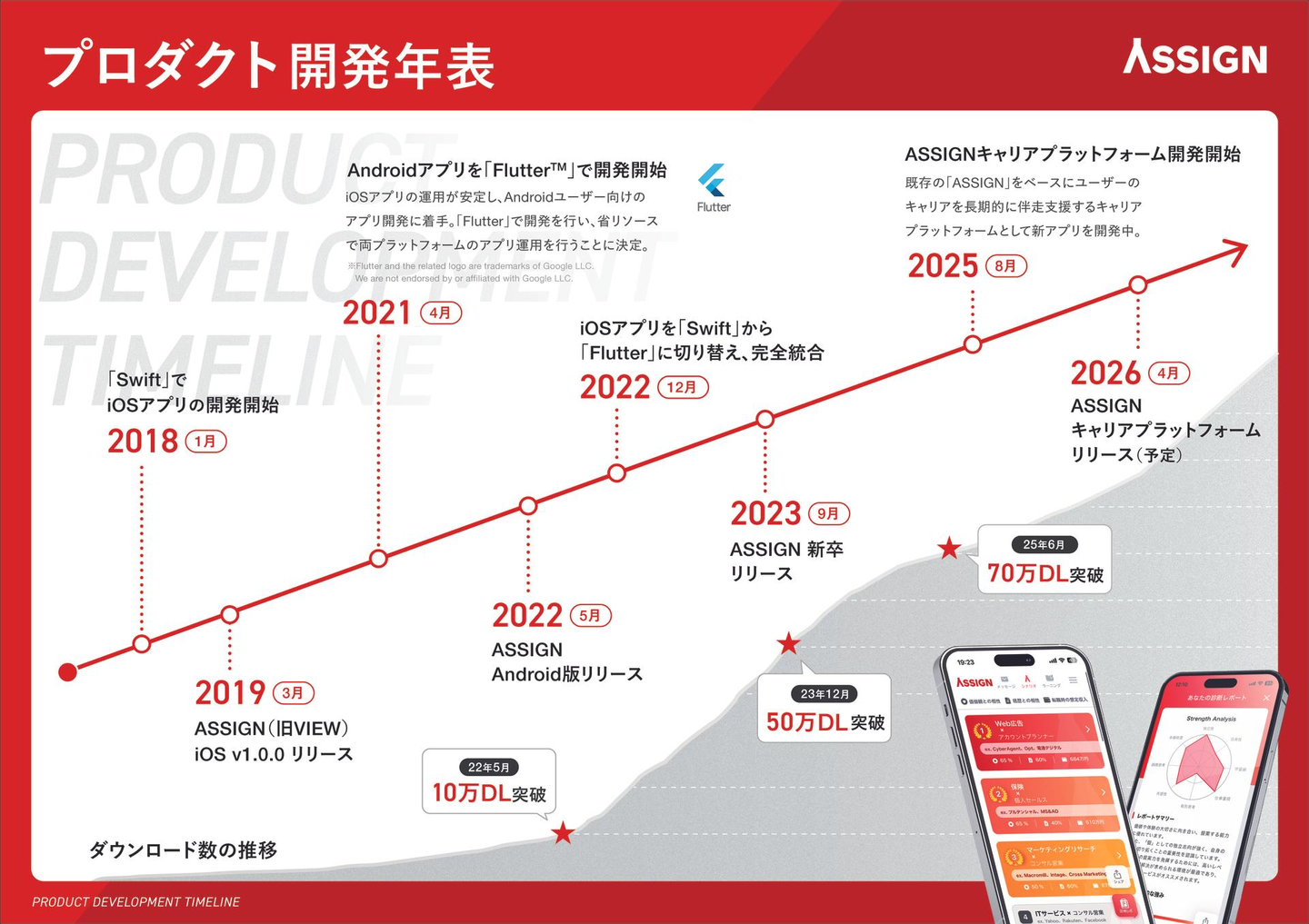 当社の自社プロダクトのグロースとFlutter採用について知っていただくために以下のような年表を展示いたしました。
