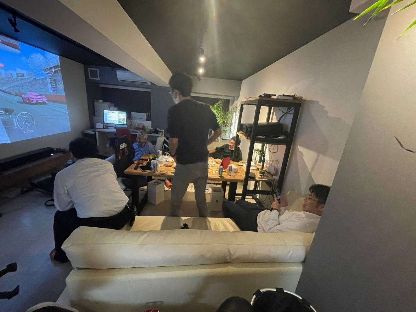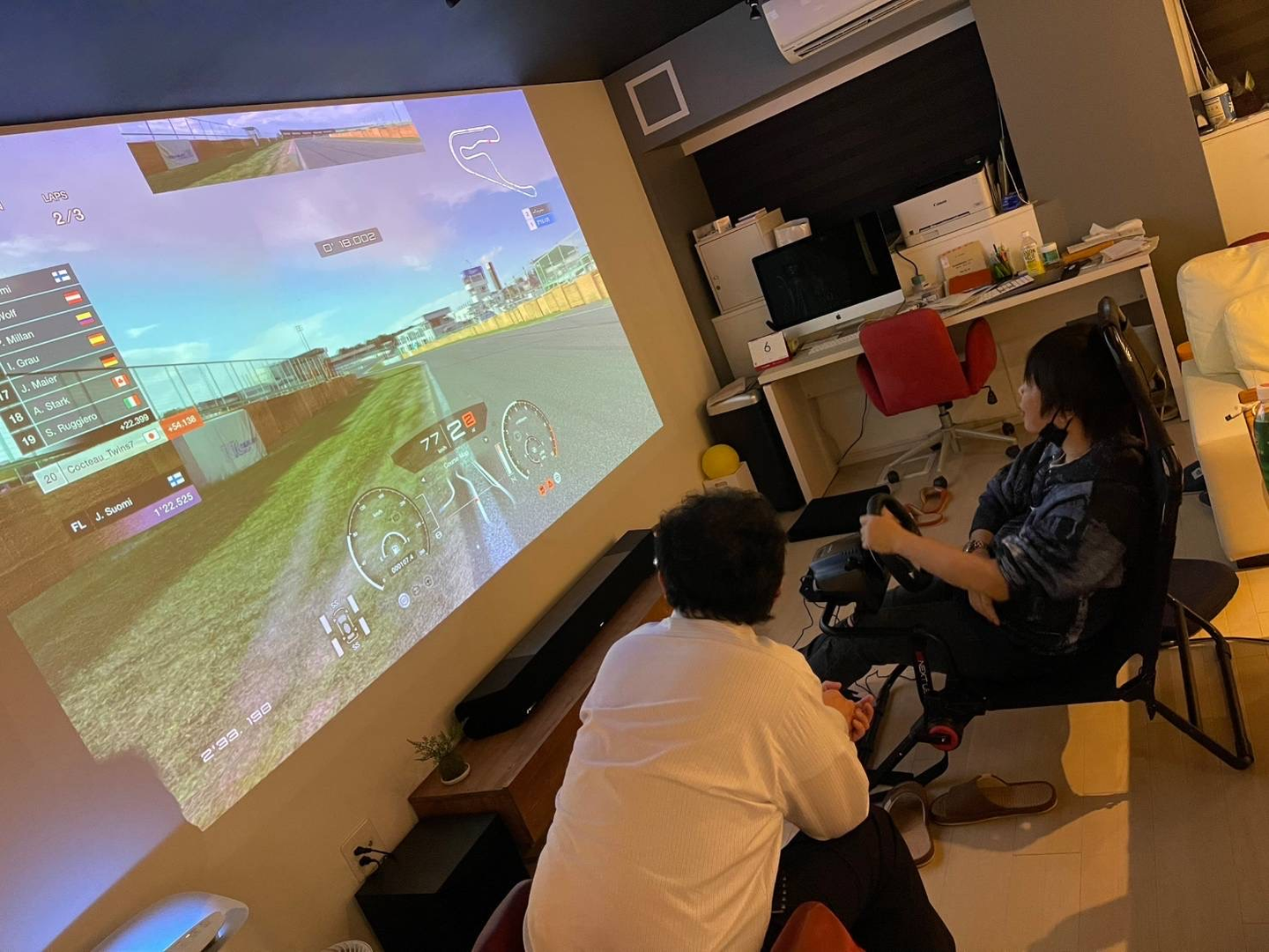 そして真面目な話が終わった後は、133インチにもなるプロジェクターと、ゼンハイザーの高級サウンドバーを使って誰が最速のドライバーか、グランツーリスモ(レーシングコックピット有)で競っています。