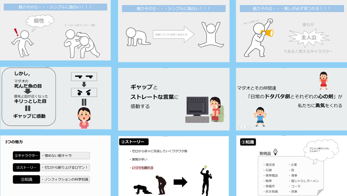 それぞれ好きなアニメについてのプレゼンということで熱が入ったものになっていました! 偶然にも同じようなジャンルの作品ということで、好きな作風も似通った3名なのかもしれません…!