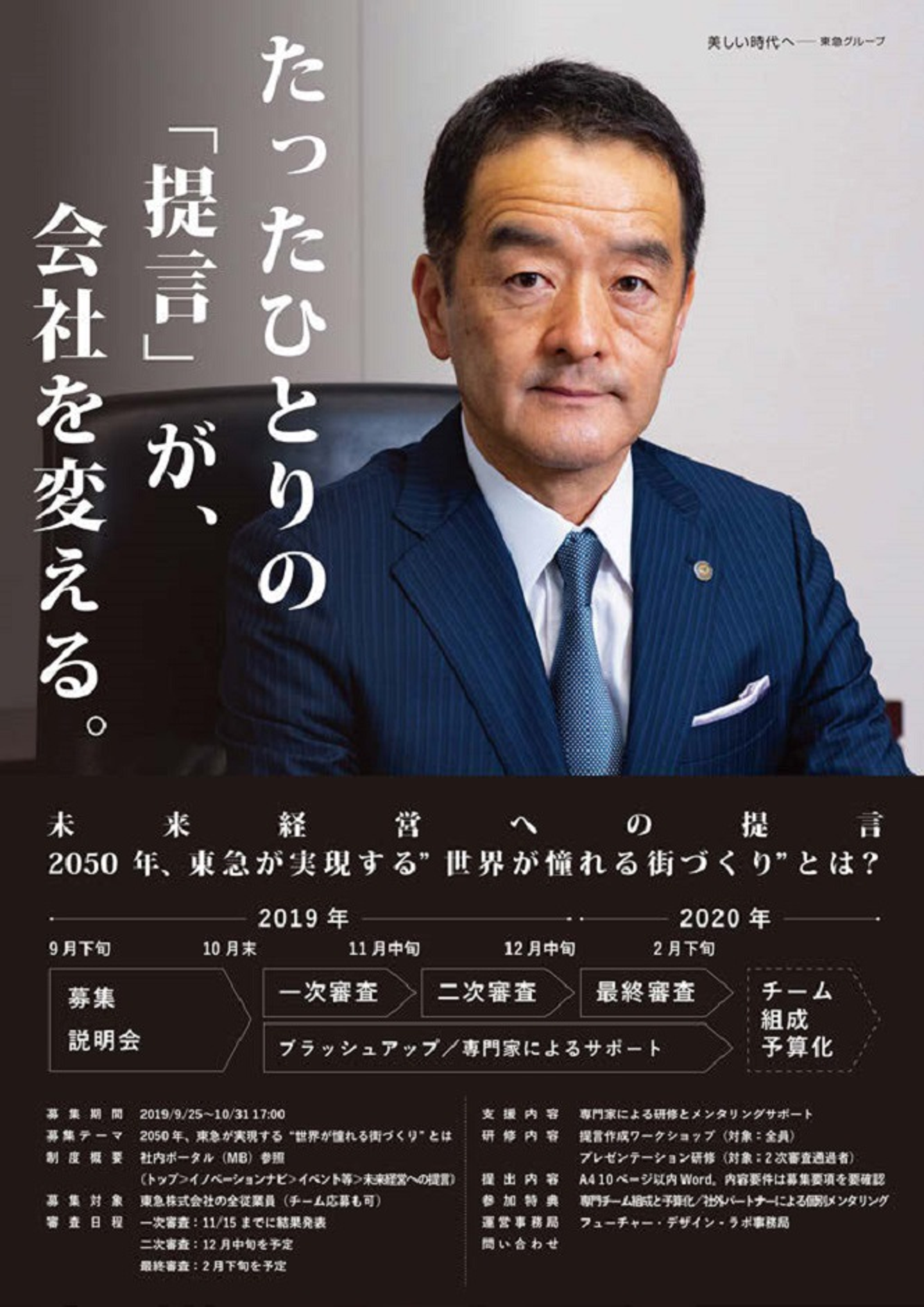 2050年における企業の存在価値から議論し、社員の中に眠る新事業の種を育て、実際に形にするところまで持っていきたい。そんな想いからフューチャー・デザイン・ラボが着手したのは、事業構想論文(A4用紙10枚程度)を社内から募る「未来経営への提言プロジェクト」だった。事業構想を社員の力で考えるコンテストであり未来の芽を育てる試みだ。