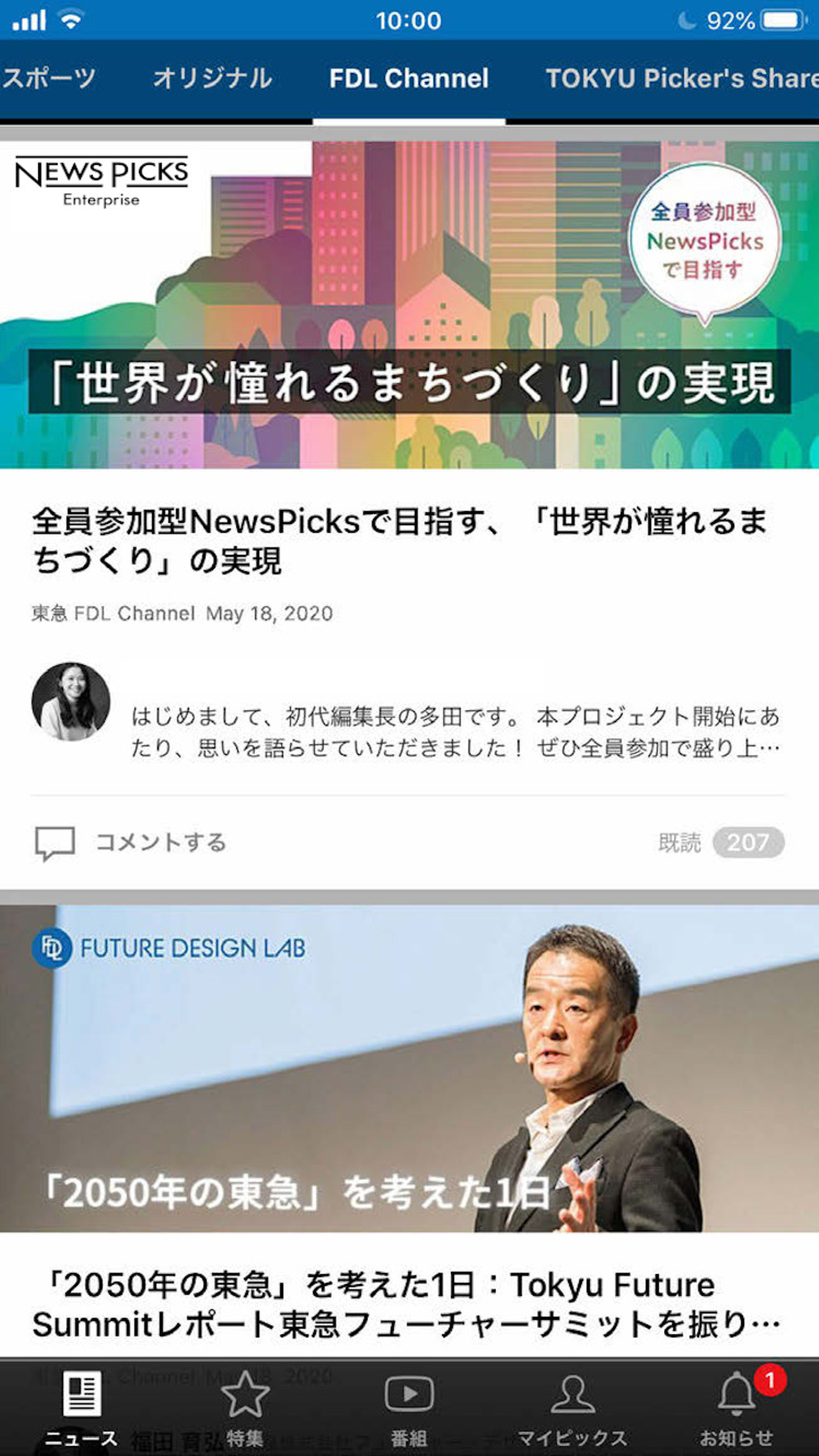 社内メディアとして活用できる企業向けのNewsPicks。通常のNewsPicksのオリジナル記事や動画コンテンツを閲覧できるだけでなく、「社員だけが閲覧できる社内タブ」が加えられる。写真は東急(株)版のNewsPicks。社内記事配信をする「FDL Channel」や、参加者同士で記事を共有したりコメントしたりする「TOKYU Picker's Share」が備わっている。