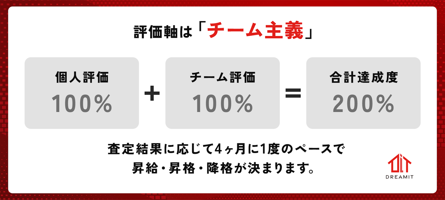 評価制度は「チーム主義」を軸とした観点で行っており、「個人評価:100%」「チーム評価:100%」の計200%の達成度で査定を行っています。その査定結果に応じて、4ヶ月に1度のペースで昇給・昇格・降格が決まります。