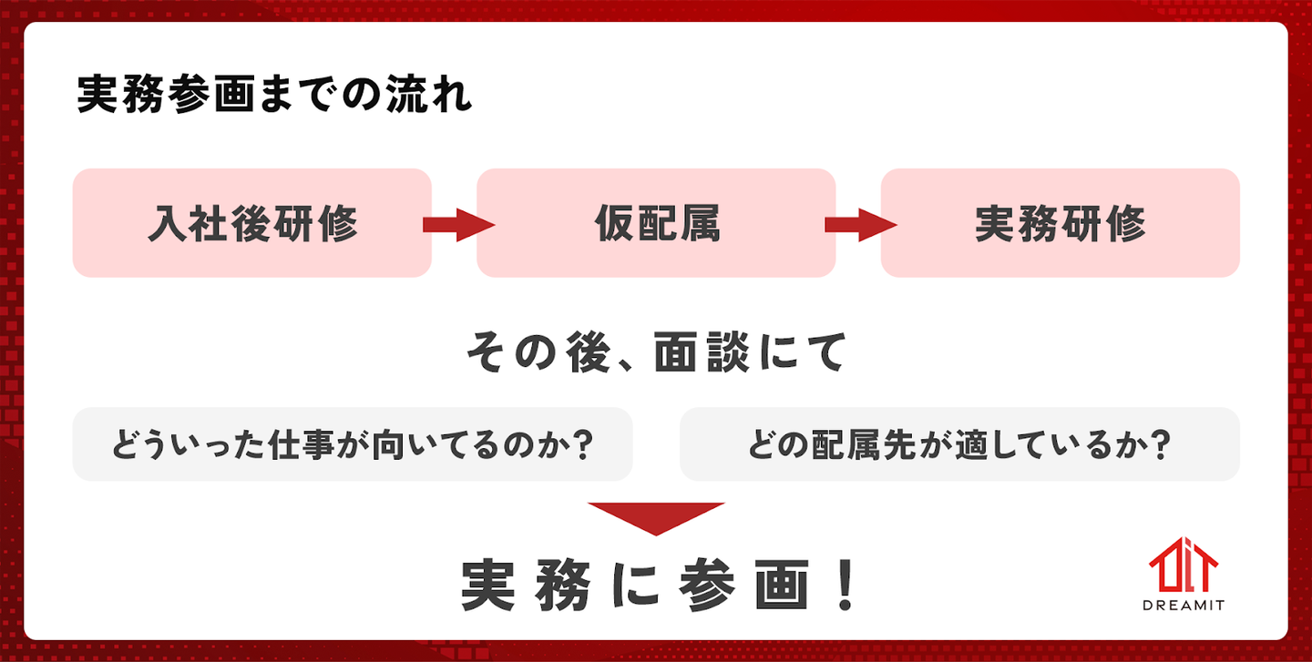 入社後、まず1ヶ月程度の研修があります。その後は仮配属という形で現場に入り、小さな役割や仕事を先輩社員と一緒にこなしていくという流れになっています。